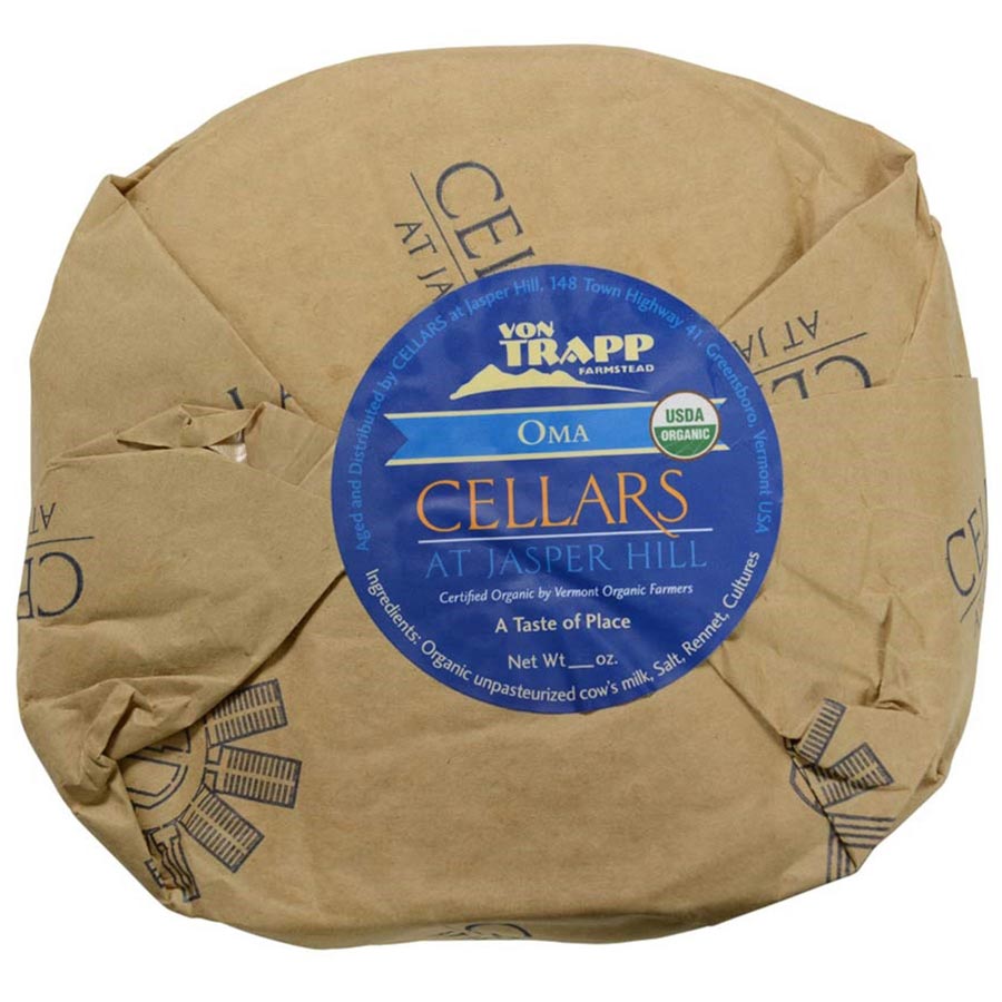 Located in Waitsfield, Vermont, the Von Trapp Farmstead is a true ‘farmstead’ family dairy. The organic milk from their primarily Jersey cow herd gets transferred only a brief distance from the milking parlor to the adjacent cheesemaking facility for production. Their commitment to making the highest quality cheese is evident in Sebastian von Trapp’s first personal recipe, Oma, meaning Grandmother, named after a prized member of the family. Oma balances pungent and sweet flavors with aromas of roasted nuts, cured meat, and cultured butter. The paste is soft, almost pudding-like, but never runny. The thin, orange rind, often overlaid with white flora, is an earthy coating to the richness of the lovely center.